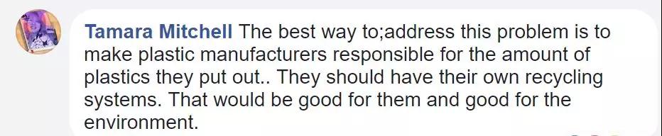 “解決這個(gè)問(wèn)題最好的方式應(yīng)該是讓那些塑料制造商對(duì)他們生產(chǎn)的塑料負(fù)責(zé),他們應(yīng)該有自己的回收系統(tǒng),這對(duì)他們自己有利的同時(shí)也有益于我們的環(huán)境?!?/p>