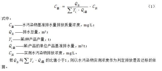 4.2.4水污染物排放濃度限值適用于單位產(chǎn)品實際排水量不高于單位產(chǎn)品基準排水量的情況。若單位產(chǎn)品實際排水量超過單位產(chǎn)品基準排水量,應(yīng)按式(1)將實測水污染物濃度換算為水污染物基準排水量排放濃度,并以水污染物基準排水量排放濃度作為判定排放是否達標的依據(jù)。產(chǎn)品產(chǎn)量和排水量統(tǒng)計周期為一個工作日。