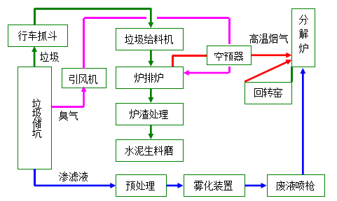 垃圾在儲存過程中生成的滲濾液為高濃度有機污水,經(jīng)過濾處理后,噴射至分解爐內(nèi)高溫蒸發(fā)氧化處理,完全分解有機成分,實現(xiàn)無害化。