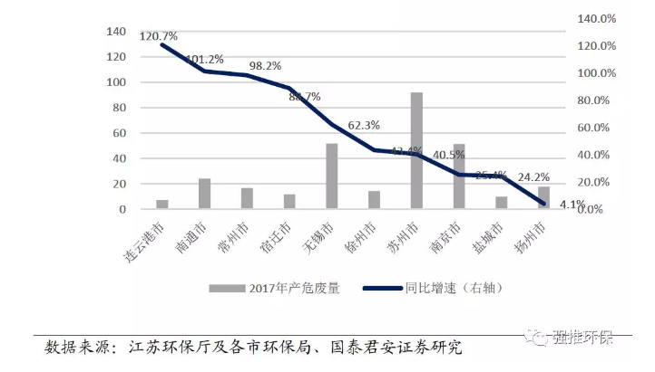 2017年,江蘇主要城市危廢產(chǎn)生量較2016年同比大增,其中連云港、南通、常州、宿遷、無錫同比增速都超過50%。