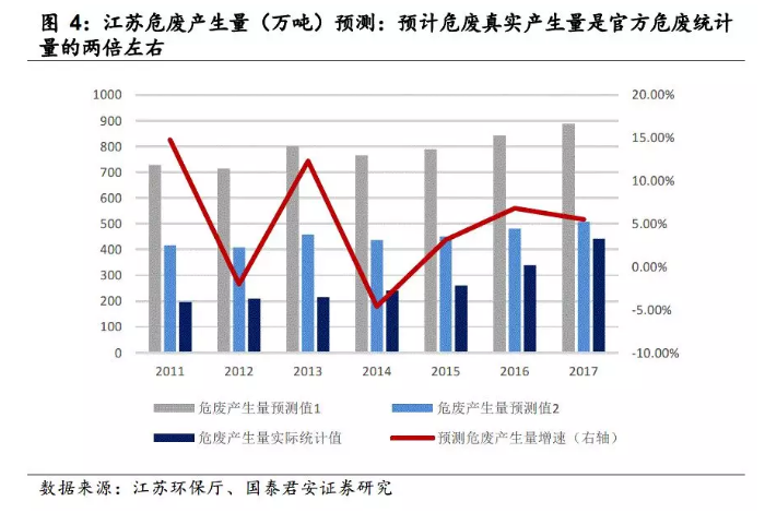 而我們預(yù)測江蘇危廢實際產(chǎn)生量是官方統(tǒng)計量的兩倍左右: