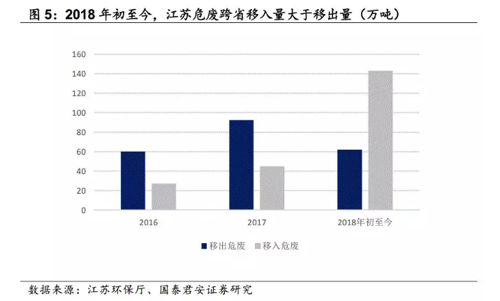 我們觀察到,單體處置產(chǎn)能全省排名第一的江蘇新春興再生資源公司,2018年初至今已從外省合計轉(zhuǎn)入8.6萬噸HW49危廢,預(yù)計外省危廢處置是其業(yè)務(wù)的重要組成部分。