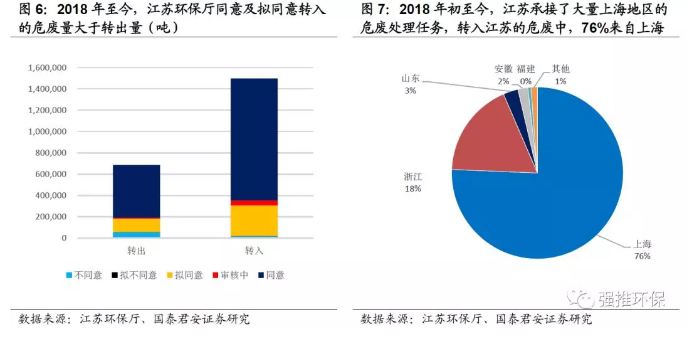 2018年初至今移入江蘇的危廢中,來自上海地區(qū)的占比76%,來自浙江地區(qū)的占比18%。