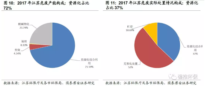 如同上文所提到的,江蘇省產(chǎn)能中,資源化、無害化占比分別為72%、28%,以2017年為例,當(dāng)年資源化、無害化處置實際處置占比分別為37%、52%,表明江蘇資源化過剩、無害化不足現(xiàn)象明顯。具體看來: