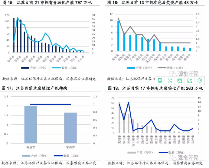 21市擁有資源化產(chǎn)能797萬噸;17市擁有危廢物化產(chǎn)能263萬噸;13市擁有危廢焚燒產(chǎn)能48萬噸;2市擁有危廢填埋產(chǎn)能3.64萬噸。