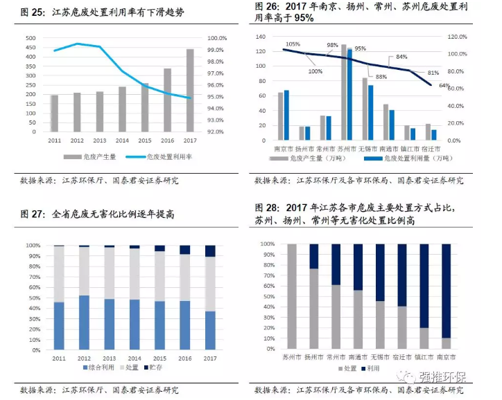 從各市的情況來看,2017年南京、揚州、常州、蘇州危廢處置利用率高于95%,無錫、南通、鎮(zhèn)江的危廢處置利用率在80%-90%之間。