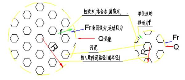 物料內(nèi)部水份必須通過熱能形成具有一定壓力的蒸汽克服遷移路徑(R)的阻力(f)才能排出顆粒表面以外,熱能(Q)是通過物料之間的傳導(dǎo),其需要傳遞的時間和過剩能量, 有一個重要的因素就是其傳導(dǎo)路徑(R)的長短;