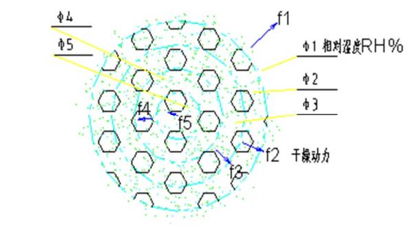 干燥動力(f1~f5):就是物料中水份(或溶液)向物料外部的遷移(蒸發(fā))的能力。其處決于物料與相鄰物體的蒸汽分壓或相對濕度(RH)的差值,差值越大,其移動或轉(zhuǎn)移的能力就越大。物體內(nèi)階梯型的相對濕度(φ1~φ5)逐漸增加,在φ1很小φ5很大時,階梯的相對濕度(RH)的差值更趨明顯,水分遷移能力就很大。而當φ1接近φ5時, 階梯的相對濕度(RH)的差值減少,水分遷移能力(蒸發(fā)強度)就很小。這就是同等條件下,干燥設(shè)備內(nèi)物料水分較小時,蒸發(fā)強度低的原因。