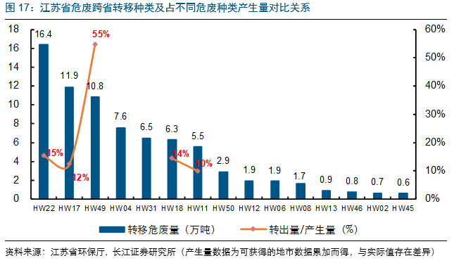 從2017年轉(zhuǎn)出危廢種類來看,含銅廢物(HW22)/表面處理廢物(HW17)/其他廢物(HW49)/農(nóng)藥廢物(HW04)/含鉻廢物(HW31)前五合計(jì)達(dá)53.1萬噸,占轉(zhuǎn)出量的69%。而從轉(zhuǎn)出量和產(chǎn)生量的比例來看,江蘇省HW49(其他廢物)對(duì)省外處理資質(zhì)依賴度高;剩下基本都在本省進(jìn)行處理。