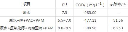 燒杯實(shí)驗(yàn)發(fā)現(xiàn),采用氫氧化鈣將該污水處理廠(chǎng)進(jìn)水pH控制在8.0~8.5,然后控制硫酸亞鐵和聚丙烯酰胺(PAM)的投加質(zhì)量濃度分別為200、3mg/L,可獲得最佳混凝效果;在實(shí)際廢水處理過(guò)程中,可較快形成大且穩(wěn)定的礬花,沉淀時(shí)間短,出水濁度低,水質(zhì)清澈透明。表2為聚合氯化鋁(現(xiàn)有污水處理廠(chǎng)預(yù)處理段混凝池所用藥劑)和硫酸亞鐵對(duì)該污水處理廠(chǎng)廢水的處理效果,結(jié)果顯示,以硫酸亞鐵為混凝劑,PAM為助凝劑,氫氧化鈣為pH調(diào)節(jié)劑,混凝處理效果較佳。
