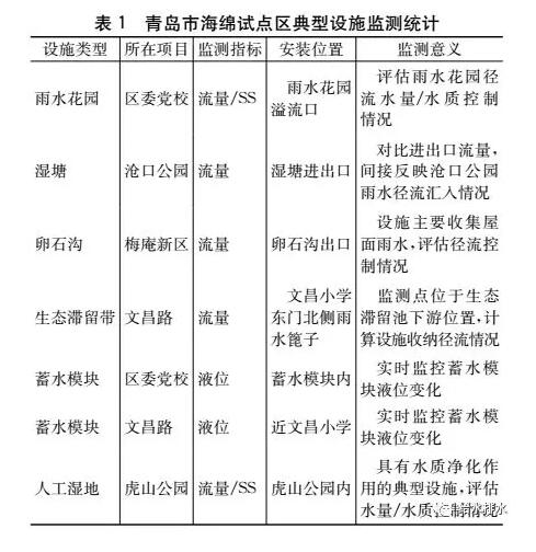 根據(jù)住建部出臺的《海綿城市建設(shè)典型設(shè)施設(shè)計參數(shù)與監(jiān)測效果要求》,需要對生態(tài)滯留設(shè)施、植草溝、CSO調(diào)蓄池、干塘、濕塘、人工濕地和綠色屋頂進行在線監(jiān)測。根據(jù)典型設(shè)施的構(gòu)造和主要效果進行在線監(jiān)測指標(biāo)的篩選:對于以水量控制為主的設(shè)施,需在線監(jiān)測水量情況,其中調(diào)蓄池和雨水桶具有穩(wěn)定液面,可進行液位監(jiān)測;對于水質(zhì)具有明顯凈化效果的設(shè)施則應(yīng)進行SS的在線監(jiān)測。青島市海綿試點區(qū)典型設(shè)施監(jiān)測情況如表1所示。