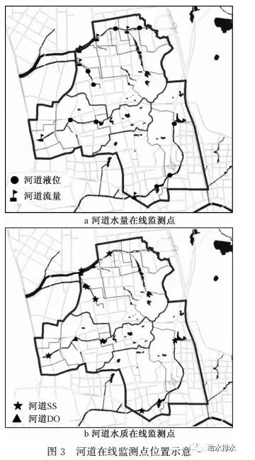 在水量監(jiān)測方面,各河道源頭均位于試點區(qū)內(nèi),在距源頭200m左右的位置進行液位在線監(jiān)測,沿途中間段布設(shè)液位計以監(jiān)測水位變化;試點區(qū)出口及支流匯入處布設(shè)流量監(jiān)測。水質(zhì)監(jiān)測方面,為對流經(jīng)試點區(qū)部分進行水環(huán)境質(zhì)量的綜合評價,在每條河道試點區(qū)范圍內(nèi)上下游各布置1臺在線SS監(jiān)測儀,河道中下游位置布設(shè)在線DO監(jiān)測儀,對河道整體的黑臭情況進行反映。河道在線監(jiān)測布點如圖3所示。