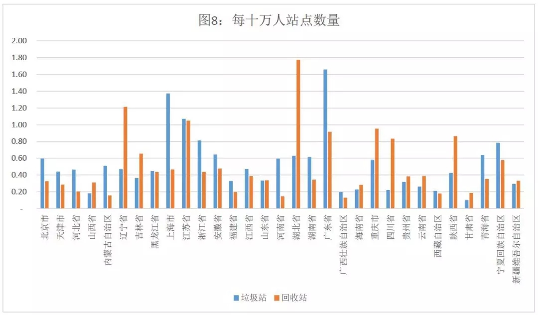 而對(duì)全國(guó)各省市每十萬(wàn)人擁有的垃圾站數(shù)量及回收站數(shù)量統(tǒng)計(jì)分析,可以看出,全國(guó)大部分省市每十萬(wàn)人擁有的垃圾站數(shù)量在0.3-0.7個(gè)之間,平均數(shù)為0.5個(gè);每十萬(wàn)人擁有的回收站數(shù)量在0.3-0.5個(gè)之間,平均數(shù)為0.5個(gè)。