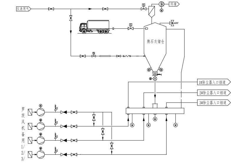 該脫酸方法是利用風(fēng)機(jī)的壓能將消石灰粉末噴射到反應(yīng)塔出口的煙道中,使得消石灰與煙道流過(guò)的煙氣中的酸性成分發(fā)生中和反應(yīng),去除酸性氣體。