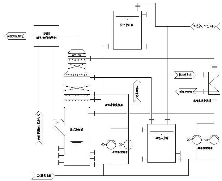 濕法脫酸工藝是利用堿性吸收劑(一般為NaOH溶液)在洗滌塔內(nèi)吸收HC1和SO2等酸性氣體。濕法凈化工藝凈化效率很高,國(guó)外多年的應(yīng)用業(yè)績(jī)均表明其對(duì)HC1的脫除效率可達(dá)99%以上,對(duì)SO2也可達(dá)到95%以上的脫除效率。但是濕法凈化工藝后續(xù)需要配置廢水處理設(shè)施,且處理后煙氣溫度一般為6O~70℃,為防止煙囪出口有“白煙”冒出,還需要配置煙氣再加熱裝置,在國(guó)內(nèi)還沒(méi)有應(yīng)用實(shí)例,可作為干法和半干法凈化工藝之后的尾氣深度凈化措施。