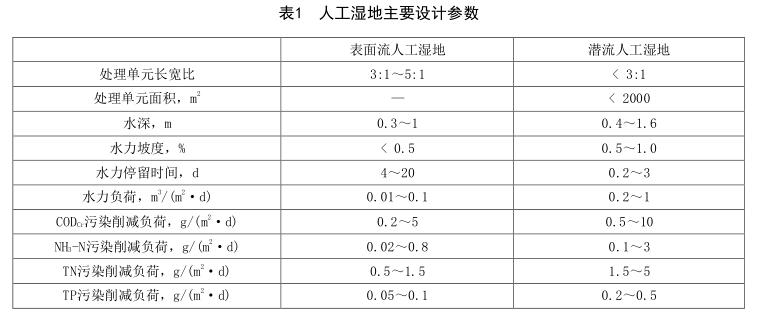 4.4.1.1人工濕地主要設(shè)計(jì)參數(shù)宜根據(jù)試驗(yàn)資料確定,無試驗(yàn)資料時,可參考表1確定。