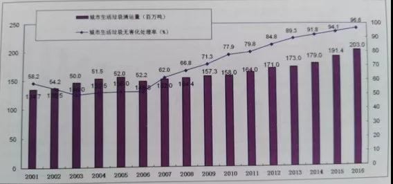 從1979年開始,隨著我國城市化的進(jìn)程,到2016年,我國城市化垃圾已經(jīng)到達(dá)兩億噸??梢钥吹?,我國城市垃圾的無害化處理在2016年已經(jīng)接近100%,可以說我國城市垃圾的無害化處理取得的成績(jī)還是非常顯著的。
