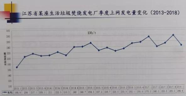 中國的生活垃圾水分比較高,一般在垃圾池中放七天左右,使大部分水分能夠析出。這樣使垃圾不僅好燒,還能用于發(fā)電。在世界范圍內(nèi),中國的焚燒處理工藝還是比較高的。上圖是江蘇省某生活垃圾焚燒發(fā)電廠季度上網(wǎng)發(fā)電情況(2013-2018),這座焚燒廠采用的是爐排爐的工藝,可以看出,這幾年的發(fā)電情況呈逐年上升的趨勢(shì)。