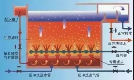 反沖洗過程一般分為三步:氣洗、氣水同時反洗、水漂洗。氣洗目的是松動濾料層,使濾料層膨脹。氣洗強度一般為10~15L/(m2*S),時間為5min。氣水同時反洗目的是將濾料上截留的懸浮物和老化的生物膜沖洗出去,水洗強度為5.0~8.5L/(m2*S),時間為5~8min。水漂洗目的是將濾料上表面的懸浮物和老化的生物膜沖洗出去,時間為為5~8min。濾層膨脹率約為10%。