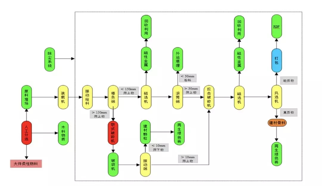 2.資源化利用主要產(chǎn)品:再生骨料、RDF燃料棒、再生木塑、有色金屬