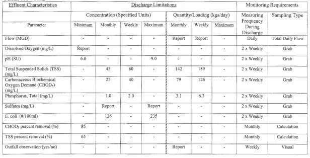 表2 美國明尼蘇達州Bois Forte-Lake Vermillion污水處理塘許可證里面的污染物限值信息(MN0061310)