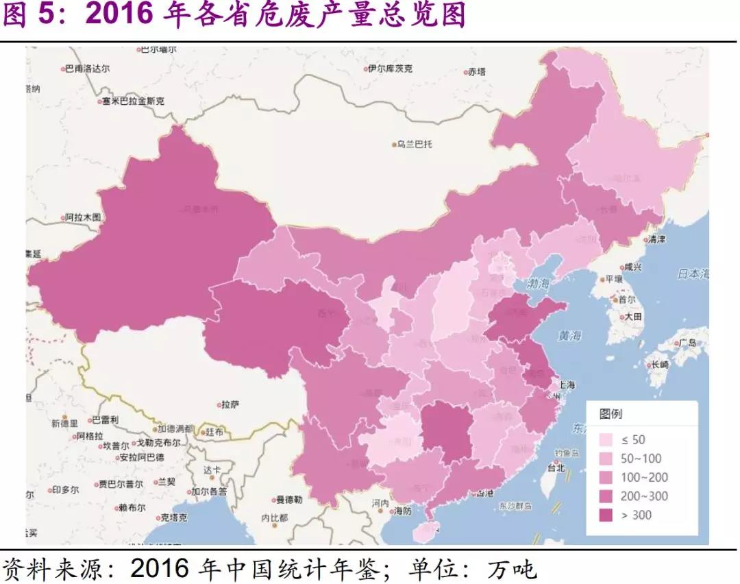 分省來看,共有14個省增速在50%以上,寧夏、海南、福建、甘肅、四川、吉林6省增速超100%,其中寧夏由2015年的9.75萬噸上升至2016年49.66萬噸,增速高達(dá)403%。產(chǎn)廢量大于200萬噸的省份由6個上升至11個,危廢產(chǎn)量前五名的省份中,江蘇由第5名上升至第3名,超越新疆、湖南。