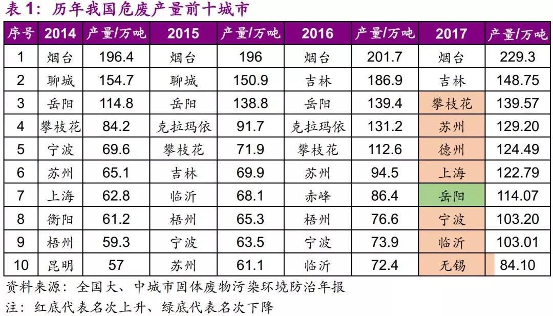 從全國危廢產(chǎn)量前十大城市來看,長三角及山東重點工業(yè)城市在列。其中蘇州、德州、上海、寧波、臨沂、無錫等城市位次相比上年均有上升。相比之下,赤峰、岳陽、梧州等城市位次下降。危廢產(chǎn)量是相關(guān)工業(yè)發(fā)展的直接產(chǎn)物,而位次的變化是相關(guān)地區(qū)工業(yè)發(fā)展與環(huán)保執(zhí)法壓力的綜合體現(xiàn)。