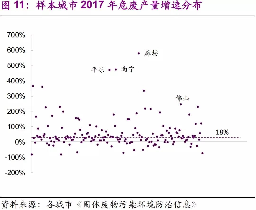 共生性體現(xiàn)在:危廢主要來源于工業(yè)生產(chǎn)過程,且治理需求反映了區(qū)域環(huán)保壓力的變化。通過對全國31省342個城市危廢信息的統(tǒng)計,我們發(fā)現(xiàn)整體產(chǎn)廢大市集中在京津冀-山東、長三角、遼沈一帶、西南重工業(yè)區(qū)等地域。從樣本數(shù)據(jù)來看,2017年全國危廢整體產(chǎn)量平均增速為18%。