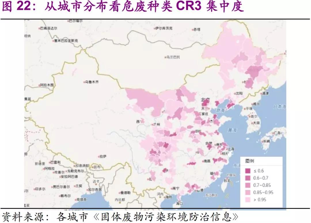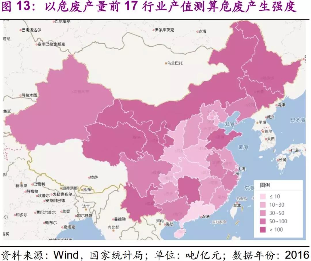 集中度上看,不管是危廢種類還是產(chǎn)廢企業(yè),西部、東北地區(qū)明顯大于東部沿海。