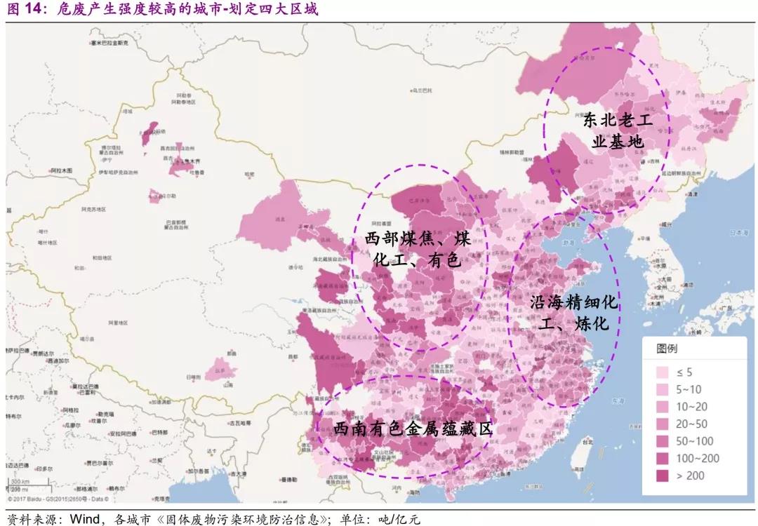 結(jié)構(gòu)性體現(xiàn)在:以每1億元工業(yè)總產(chǎn)值所產(chǎn)生的危廢量定義危廢產(chǎn)生強(qiáng)度,則危廢產(chǎn)生強(qiáng)度較低的區(qū)域集中在京津冀地區(qū)、河南、湖北、陜西等中部省份及廣東地區(qū);危廢產(chǎn)生強(qiáng)度>200的城市則主要分布于東北老工業(yè)基地集群,西部煤焦、煤化工、有色集群,沿海精細(xì)化工、煉化集群,西南有色金屬集群。