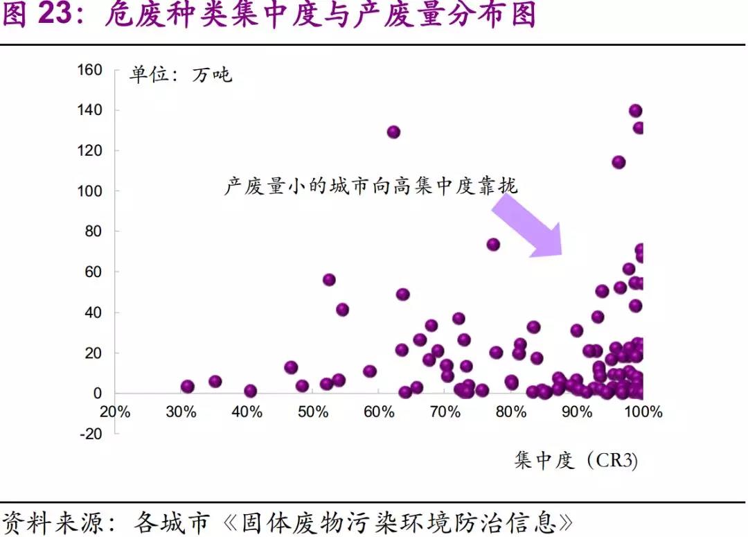 集中度高的影響:1)產(chǎn)廢企業(yè)產(chǎn)值占比較大,抗環(huán)保整治能力較強(qiáng),與政府有較強(qiáng)的話語權(quán);2)工業(yè)結(jié)構(gòu)較為單一,處置搭配簡單、單價低。