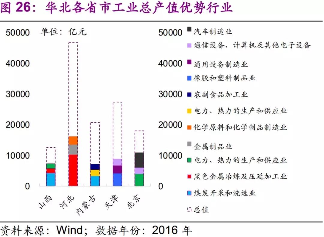 從全行業(yè)來看,北京、天津、河北、山西、內(nèi)蒙古優(yōu)勢產(chǎn)業(yè)分別為汽車制造業(yè)、橡膠和塑料制品業(yè)、黑色金屬冶煉及壓延加工業(yè)、煤炭開采和洗選業(yè)和煤炭開采和洗選業(yè)。