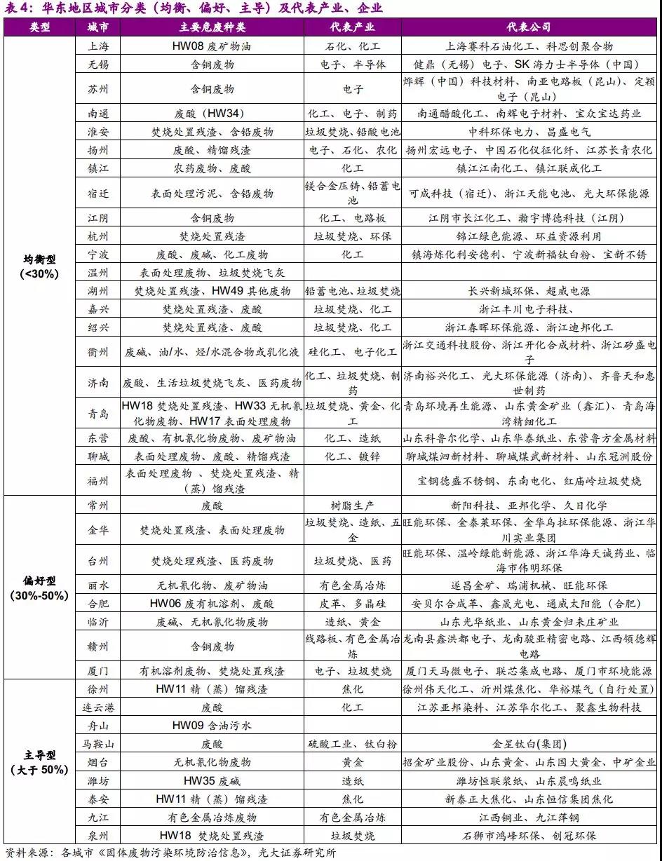 華東地區(qū)產(chǎn)廢大市集中于長三角及山東地區(qū)。華東地區(qū)產(chǎn)業(yè)結(jié)構(gòu)較為完善,因此,各個城市對利用和處置產(chǎn)能的需求較為均衡。