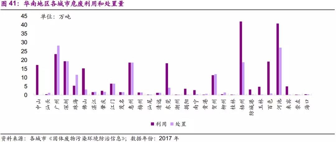 廣東省利用能力嚴(yán)重過剩,處置能力缺乏;廣西城市間差別較大??赡茉蛟谟谕ㄐ旁O(shè)備、計算機(jī)及其他電子設(shè)備制造業(yè)所產(chǎn)生的危廢利用價值較高,資源化產(chǎn)能自發(fā)建造較多,而無害化產(chǎn)能建設(shè)相對滯后。而廣西多數(shù)城市危廢種類較為單一,產(chǎn)廢量巨大,而工業(yè)總產(chǎn)值卻不高。城市間產(chǎn)能的差別可能與具體冶煉金屬種類有關(guān)。