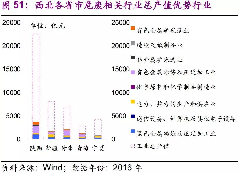 因此,我們認(rèn)為西北地區(qū)應(yīng)重點關(guān)注有色金屬冶煉和壓延加工業(yè)及黑色金屬冶煉及壓延加工業(yè)所產(chǎn)生的危廢,如有色金屬冶煉廢物、廢酸等。