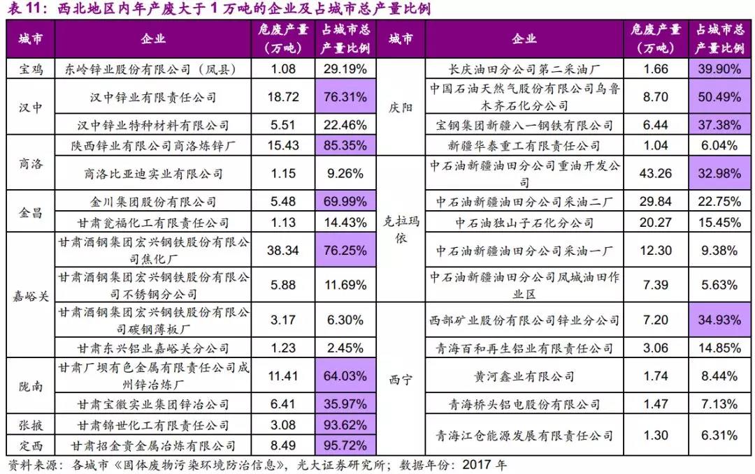 西北地區(qū)城市產(chǎn)業(yè)結(jié)構(gòu)較為單一,以主導(dǎo)型城市為主。主要產(chǎn)業(yè)有:1)石油和天然氣開采,如延安、慶陽、克拉瑪依;2)有色冶煉,如漢中、商洛、隴南、西寧;3)焦化及煤化工,如渭南、嘉峪關(guān)、韓城。產(chǎn)廢量占所在城市產(chǎn)廢量比例較大的企業(yè)有:漢中鋅業(yè)有限責(zé)任公司(76%)、商洛陜西鋅業(yè)有限公司商洛煉鋅廠(85%)、嘉峪關(guān)甘肅酒鋼集團(tuán)宏興鋼鐵股份有限公司焦化廠(76%)、定西甘肅招金貴金屬冶煉有限公司(96%)。