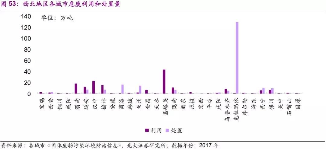 陜西整體產(chǎn)能過剩,甘肅、寧夏、新疆則利用產(chǎn)能過剩,處置產(chǎn)能不足。陜西北部以石油和天然氣開采為主,南部有色冶煉發(fā)達(dá),中部地區(qū)則以焦化、電子產(chǎn)業(yè)為主,整體上利用和處置產(chǎn)能均較為充足。甘肅北部以醫(yī)藥、石化產(chǎn)業(yè)為主,南部則為有色冶煉,整體上無害化處置產(chǎn)能較為稀缺。新疆地區(qū)克拉瑪依危廢產(chǎn)量在120萬噸以上,主要是廢礦物油和廢堿,公告顯示以焚燒處置為主。