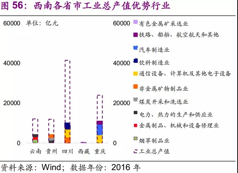 從全行業(yè)來看,四川、貴州、云南、重慶、西藏的優(yōu)勢產(chǎn)業(yè)分別為煤炭開采和洗選業(yè)、煙草制品業(yè)、汽車制造業(yè)、金屬制品業(yè)。