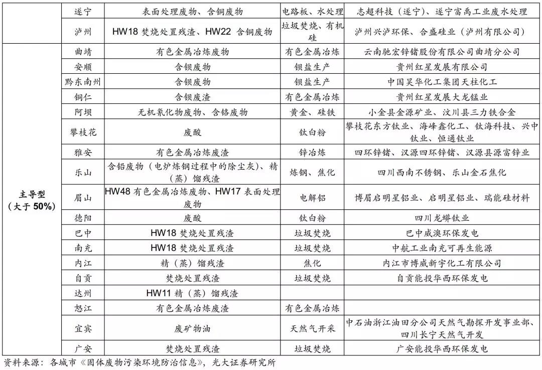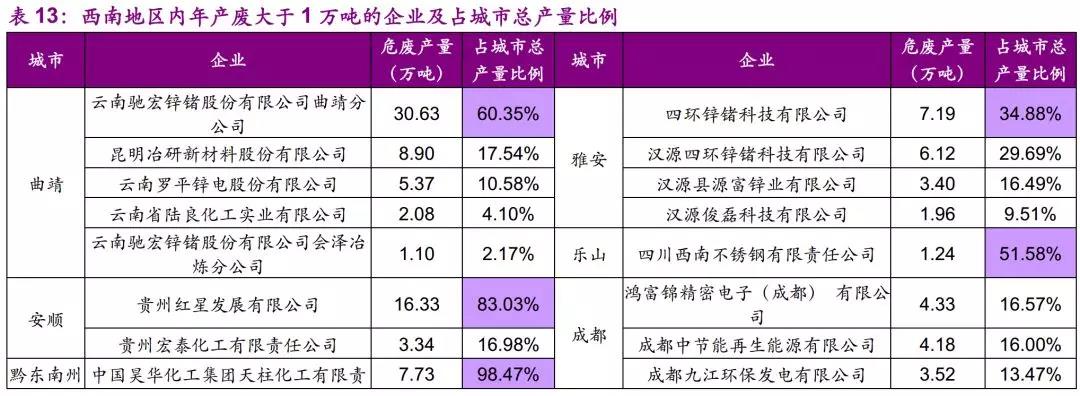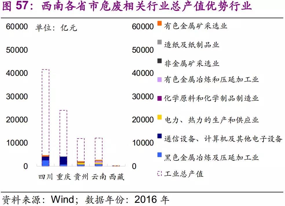 因此,我們認(rèn)為西南地區(qū)應(yīng)重點關(guān)注通信設(shè)備、計算機(jī)及其他電子設(shè)備制造業(yè)及黑色金屬冶煉及壓延加工業(yè)所產(chǎn)生的危廢,如含銅廢物、廢酸等。此外,貴州、云南作為有色金屬大省,工業(yè)總產(chǎn)值不高,但相關(guān)產(chǎn)業(yè)發(fā)達(dá),也需要重點關(guān)注。