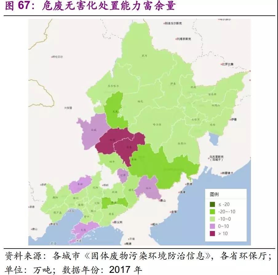 整體來看,東北地區(qū)利用能力富余,處置能力普遍不足。遼寧地區(qū)利用產(chǎn)能最為豐富,基本實現(xiàn)每個市都有富余,吉林省其次,黑龍江則利用和處置能力雙不足。其中吉林、鞍山利用能力缺口在20-40萬噸級別,吉林、大慶、本溪處置能力缺口在10-20萬噸級別。