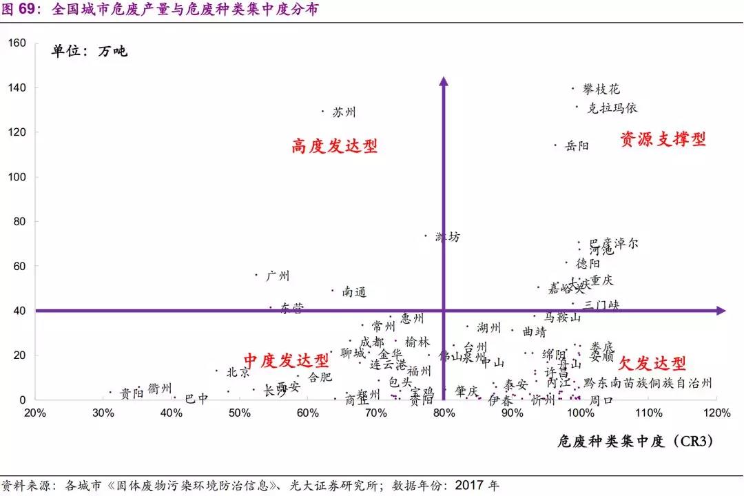 從2017年各市危廢增速來看,東部沿海地區(qū)延續(xù)高景氣度。從危廢種類和產(chǎn)廢企業(yè)集中度來看,東部地區(qū)種類更復(fù)雜,處理工藝要求更高。從城市分類來看,均衡型城市處置需求最為復(fù)雜。