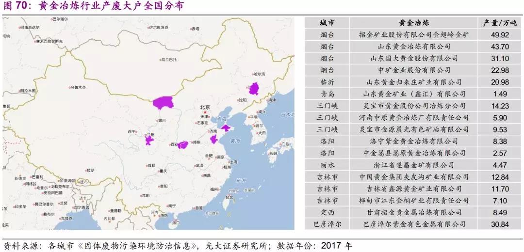 我國黃金冶煉行業(yè)產(chǎn)廢大戶主要分布于山東、河南、吉林三省,內(nèi)蒙古及甘肅亦有少量分布。其中山東省以煙臺為中心,煙臺市2017年工業(yè)危險廢物產(chǎn)生量10萬噸以上企業(yè)6家,其中五家為黃金冶煉行業(yè),分別為招金礦業(yè)股份有限公司金翅嶺金礦(50萬噸)、山東黃金冶煉有限公司(44萬噸)、山東國大黃金股份有限公司(31萬噸)、中礦金業(yè)股份有限公司(23萬噸)、山東恒邦冶煉股份有限公司(19萬噸),主要危險廢物為黃金冶煉氰化尾渣。