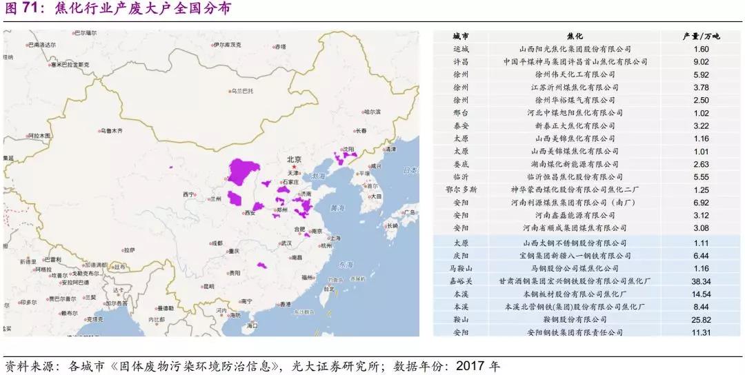 我國焦化行業(yè)產(chǎn)廢大戶主要分布于華北地區(qū),可分為兩類:一是獨立焦化企業(yè),主要分布于山東、山西等地,如中國平煤神馬集團(tuán)許昌首山焦化有限公司(9萬噸)、河北中煤旭陽焦化有限公司(1萬噸)等;二是鋼鐵企業(yè)自建焦化廠,主要分布于本溪、鞍山、安陽等地,如本鋼板材股份有限公司焦化廠(15萬噸)、鞍鋼股份有限公司(26萬噸)、安陽鋼鐵集團(tuán)有限責(zé)任公司(11萬噸)等。整體來看,鋼鐵企業(yè)自建焦化廠規(guī)模大于獨立焦化廠。