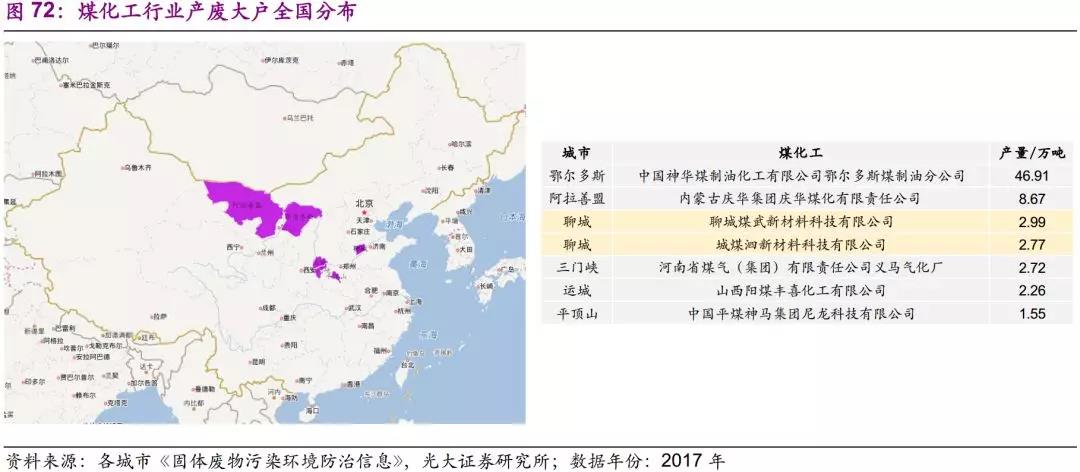 煤化工行業(yè)主要分布于內(nèi)蒙古、山東、河南等地。總體來看,行業(yè)分布較為集中,且規(guī)模較小。除中國神華煤制油化工有限公司鄂爾多斯煤制油分公司(47萬噸)以外,其余企業(yè)年危廢產(chǎn)量均在10萬噸以下。