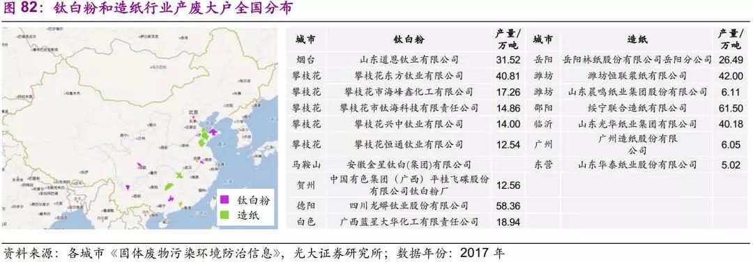 鈦白粉和造紙造紙行業(yè)分布較為集中。其中攀枝花作為鈦白粉產(chǎn)業(yè)集中地,每年僅廢酸產(chǎn)量就達(dá)120萬噸,2017年產(chǎn)廢量前5位均為鈦白粉生產(chǎn)企業(yè),分別是攀枝花東方鈦業(yè)有限公司(41萬噸)、攀枝花市海峰鑫化工有限公司(17萬噸)、攀枝花市鈦??萍加邢挢?zé)任公司(15萬噸)、攀枝花興中鈦業(yè)有限公司(14萬噸)、攀枝花恒通鈦業(yè)有限公司(13萬噸)。造紙企業(yè)產(chǎn)廢大戶則主要分布于山東、湖南兩省,主要有邵陽綏寧聯(lián)合造紙有限公司(62)萬噸、濰坊濰坊恒聯(lián)漿紙有限公司(42萬噸)、臨沂山東光華紙業(yè)集團(tuán)有限公司(40萬噸)等。