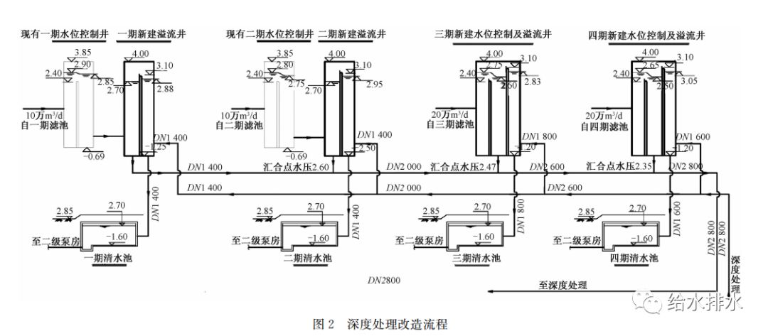 (1)現(xiàn)有各流程運(yùn)行獨(dú)立性。一期~四期出水接入深度處理的總管接管點(diǎn)處最高水壓受到調(diào)節(jié)水池水位和輸送流量的變化影響。各期濾池和沖洗泵房的運(yùn)行需要排除接管點(diǎn)水壓變化的干擾,保證自身工藝流程運(yùn)行的穩(wěn)定性?,F(xiàn)狀一期和二期設(shè)有濾池出水堰和反沖洗泵房進(jìn)水所需水位控制井,但三期和四期僅設(shè)有濾池出水堰,而無反沖洗水位控制井。因此,當(dāng)深度處理調(diào)節(jié)水池水位變化時(shí),不會(huì)影響一期和二期的正常運(yùn)行,而三期和四期沖洗水位無法保證。本次工程為三期和四期設(shè)置專門的沖洗水位控制措施——水位控制堰,保證沖洗水位。各期正常運(yùn)行進(jìn)入深度處理的水位控制高程及相應(yīng)工程措施,見工藝流程圖2。
