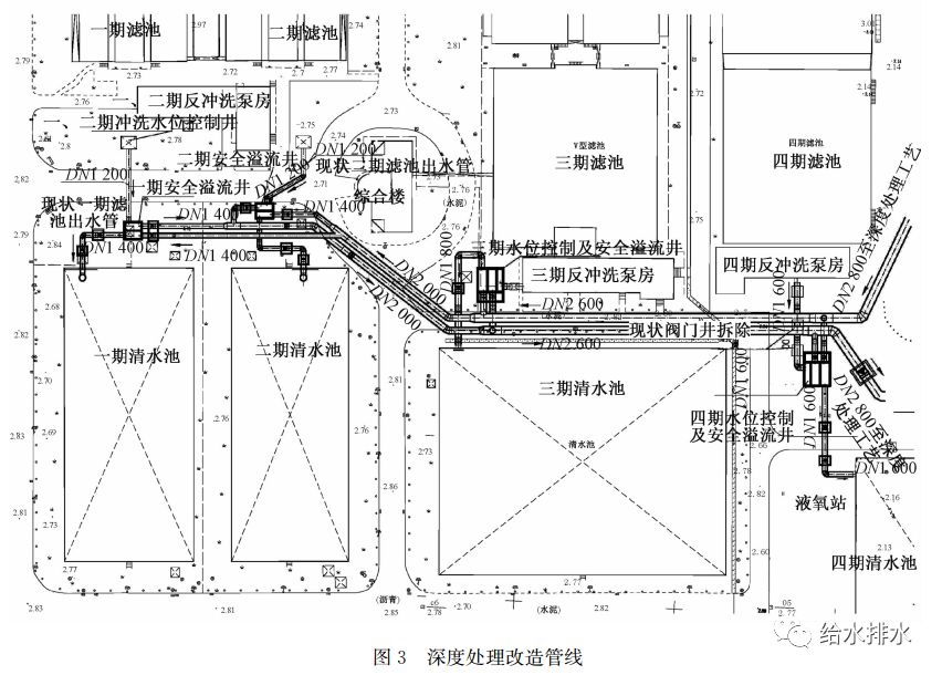 (3)各期流程應(yīng)保持進(jìn)出水均衡。由于各期至深度處理系統(tǒng)的距離相差較大,在滿足最遠(yuǎn)的一期工程水力高程需要時(shí),工程設(shè)計(jì)應(yīng)采取相應(yīng)措施,確保各期進(jìn)入深度處理以及深度處理出水回到各期清水池輸送水量的均衡,使清水池調(diào)蓄量利用充分。
