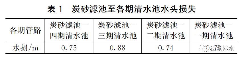 (2)深度處理出水均衡返回。由于各期清水池距離相差較大,深度處理出水至各清水池的水頭損失差需要控制,以保證清水池容積的充分利用和不浪費(fèi)水頭。本工程適當(dāng)優(yōu)化放大至各清水池的管徑(見圖3),設(shè)計(jì)計(jì)算各期清水池進(jìn)水水頭見表1。其中三期清水池接入管道最為復(fù)雜,以其水損最大為0.88 m。但各期相差數(shù)值較小,滿負(fù)荷運(yùn)行時(shí),最大水損差值僅為0.15 m,基本可以不考慮其影響,能確保深度處理出水均衡返回,清水池容積可以得到充分利用。