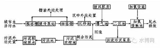 傳統(tǒng)活性污泥法及其傳統(tǒng)形式改進(jìn)型,有A/O與A2/O法。A/O法有兩種,一是用于降磷的厭氧-好氧工藝,一是用于降氮的缺氧-好氧工藝。A2/O法則是即除氮又除磷的工藝?;钚晕勰喾ǖ淖罨玖鞒淌窍蛭鬯凶⑷肟諝膺M(jìn)行曝氣,并持續(xù)一段時間后,污水中即生成一種絮凝體,這種絮凝體主要由大量繁殖的微生物群體所構(gòu)成,它易于沉淀分離,并使污水得到澄清,這就是“活性污泥”?;钚晕勰喾▌t是以活性污泥為主體的生物處理方法,它的主要構(gòu)筑物是曝氣池和二次沉淀池,如下圖所示:
