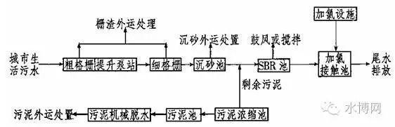 (6)除磷脫氮。一個運(yùn)行周期內(nèi),厭氧、兼氧、好氧交替變化,在一個池內(nèi)實(shí)現(xiàn)了除磷脫氮。其工藝流程如下(包括污泥處理)。